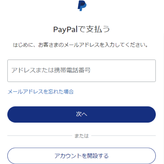 PayPalを初めてご利用の場合アカウントを開設します。案内に従ってメールアドレス、パスワード、電話番号、カード情報等をご入力ください。ご登録いただくと、次回以降のご購入がより便利になります。